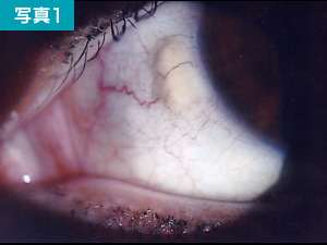 瞼裂斑(写真1)といってこれ自体は病気と考えるものではなく、結膜の増殖で紫外線に関係してできるものとされています。